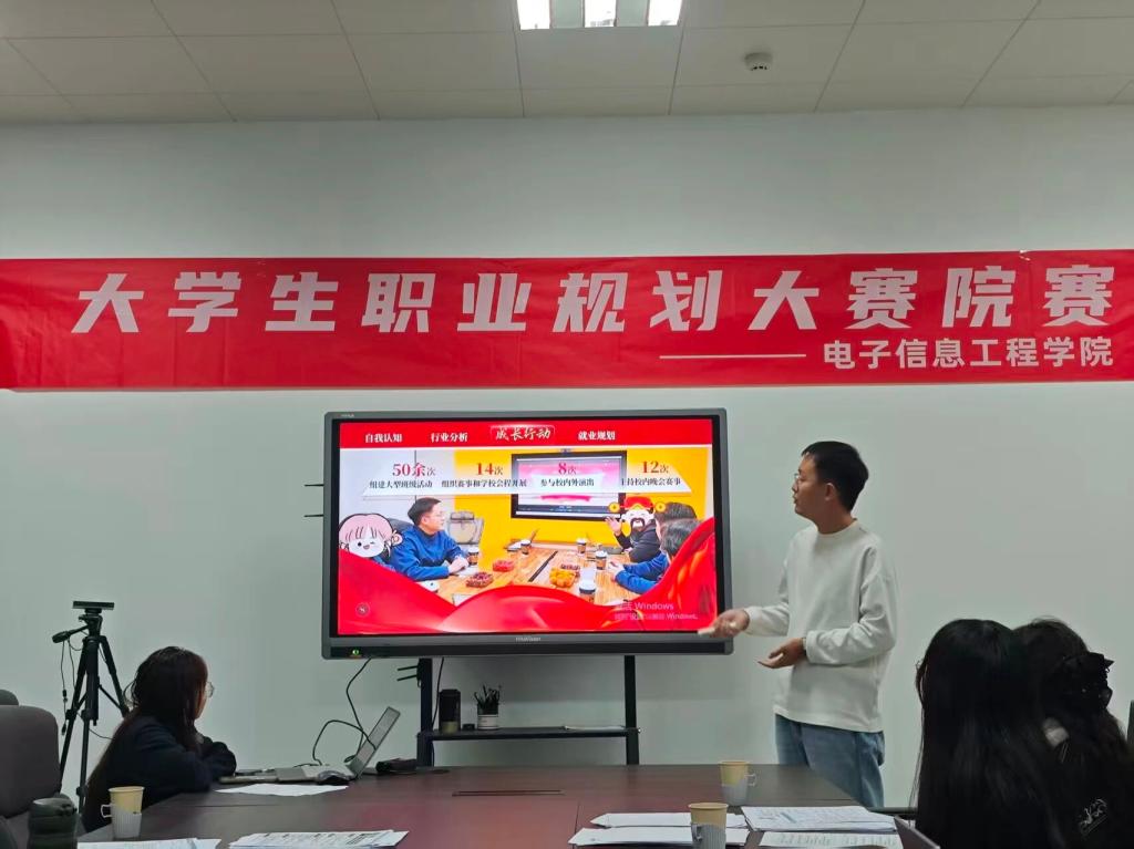 上周,电子信息工程学院大学生职业规划大赛院赛分场次圆满举办。本次大赛以“筑梦职业生涯,启航精彩未来”为主题,下设就业赛道与成长赛道,旨在精准引导不同阶段学生明确职业方向,提升就业竞争力与职业发展潜力,为电子信息领域培养高素质人才。其中,研究生专场于周三下午3点在D2-318率先开赛,本科生专场于周四下午3点在A2-504接续进行,研究生参与就业赛道比拼,本科生可根据自身需求选择任一赛道参赛。