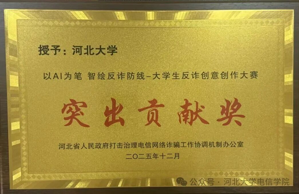 为切实筑牢校园反诈防线,全面提升大学生识诈防诈能力,由河北省人民政府打击治理电信网络诈骗工作协调机制办公室主办的“以 AI 为笔,智绘反诈防线”大学生反诈创意创作大赛顺利举办。我院作为本次大赛承办单位,凭借优质的赛事承办效果,助力学校荣获本次比赛突出贡献奖。