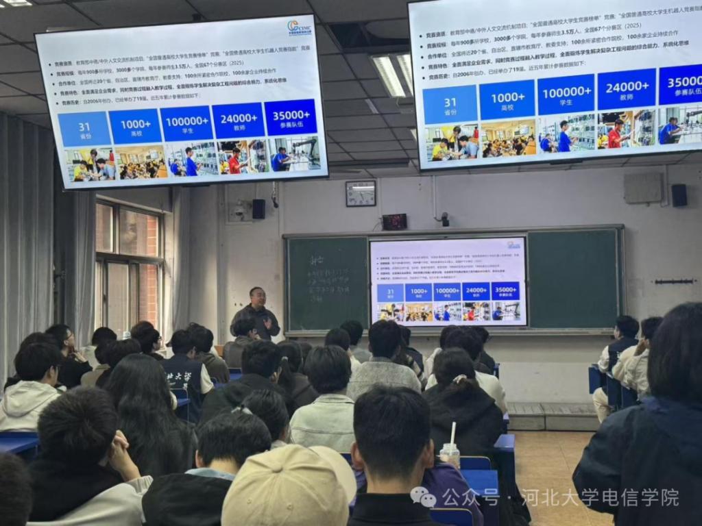 为进一步激发我校学子科技创新热情,帮助同学们深入了解河北大学第六届“科海杯”智能制造挑战赛及第二十届CIMC“西门子杯”中国智能制造挑战赛赛事详情,做好赛事参赛筹备工作,助力学子在科创竞赛中斩获佳绩,未来工业协会特于3月27日在河北大学七一路校区A2-103举办河北大学第六届“科海杯”智能制造挑战赛专题宣讲会。本次宣讲会不仅吸引了我校各年级同学积极参与,更有周边高校相关专业师生等外单位人员专程到场交流学习,现场座无虚席,形成了浓厚的跨校学习与交流氛围,充分彰显了“科海杯”智能制造挑战赛及“西门子杯”赛事在区域内乃至行业中的广泛影响力与吸引力。宣讲会聚焦赛事核心信息与参赛要点,为全校及外单位有意向参赛的人员带来全方位的赛事解读,搭建起优质的科创交流与合作平台。