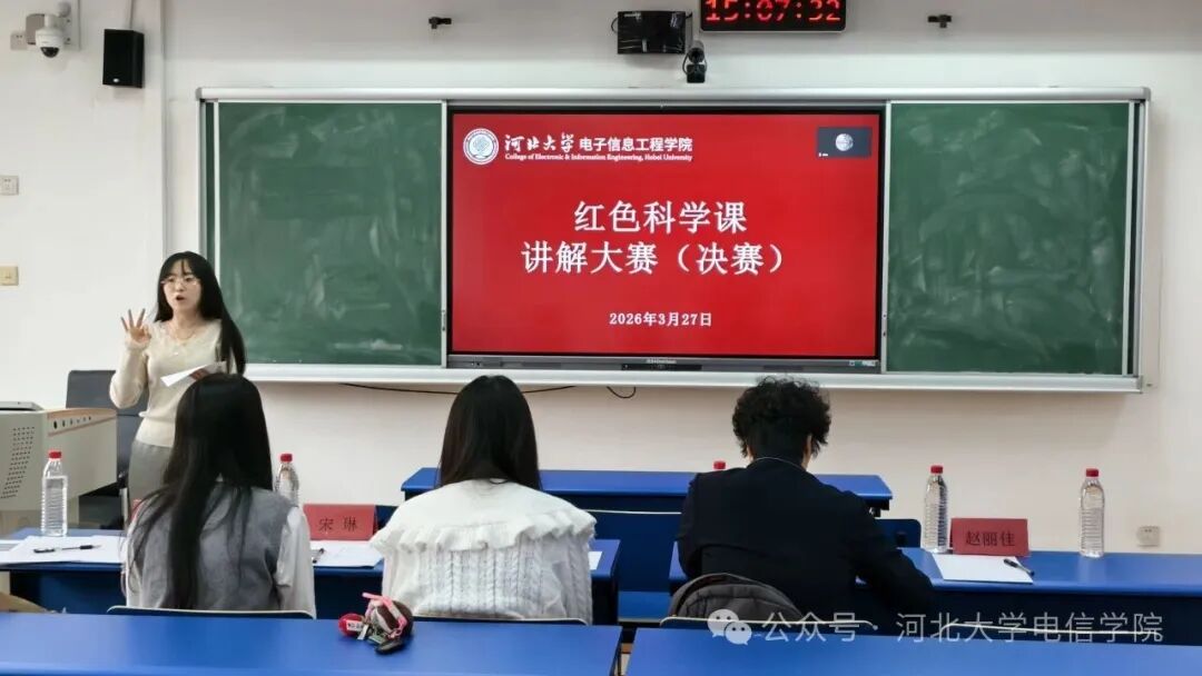 为纪念中国人民抗日战争暨世界反法西斯战争胜利80周年,传承革命先辈廉洁奉公、艰苦奋斗、科学救国的红色品格,我校于2025年12月正式启动第二届红色科学课讲解大赛。本次大赛由校团委与电子信息工程学院联合主办,以抗战精神铸风骨,科学报国勇争先为主题,将红色基因、科学精神与廉洁修身教育深度融入课堂实践,引导青年学生从红色历史中汲取力量、在科学探索中坚守初心、于时代征程中涵养清风正气。决赛于2026年3月27日顺利举办。大赛特邀保定市一中分校原校长、莲池区政府督学和晓倩,河北大学校团委教师许珂,河北大学赴新疆生产建设兵团兴新职业技术学院援疆教师赵丽佳,电子信息工程学院团委教师刘志佳、团委副书记宋琳组成专业评审团。电子信息工程学院党委副书记杜凯华出席活动并致辞,向全体参赛选手、指导老师及评审嘉宾表示诚挚欢迎与衷心感谢。