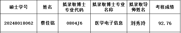 根据《河北大学硕博连读研究生招生培养工作管理办法》(校政字〔2024〕39号)文件精神,按照《河北大学2026年硕博连读研究生招生录取办法》及《电子信息工程学院2026年硕博连读研究生选拔工作实施细则》,学院组织了医学电子信息专业硕博连读研究生考核工作,现将该专业硕博连读研究生综合考核成绩公布如下: